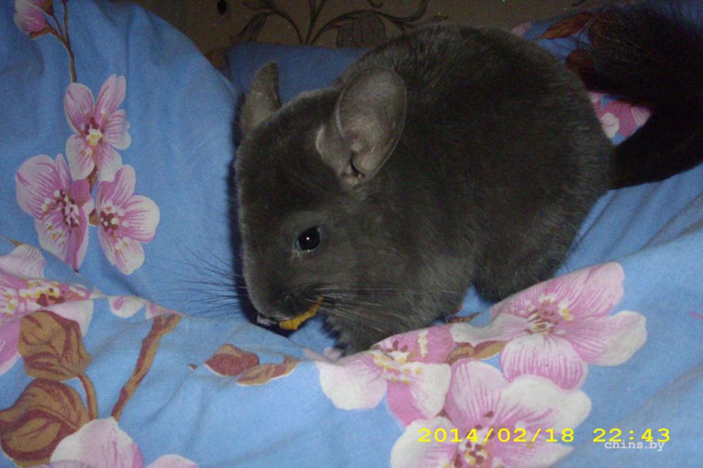 | Дополнительная информация: | (Возможно фиолетовый эбони экстра темный,высветлений нет)Мама Ульси-фиолетовый эбони средний(питомник "Ok!Chinchillas",Москва);Папа Кейси-темный эбони НФ(питомник"Chinchilland",Нидерланды. |