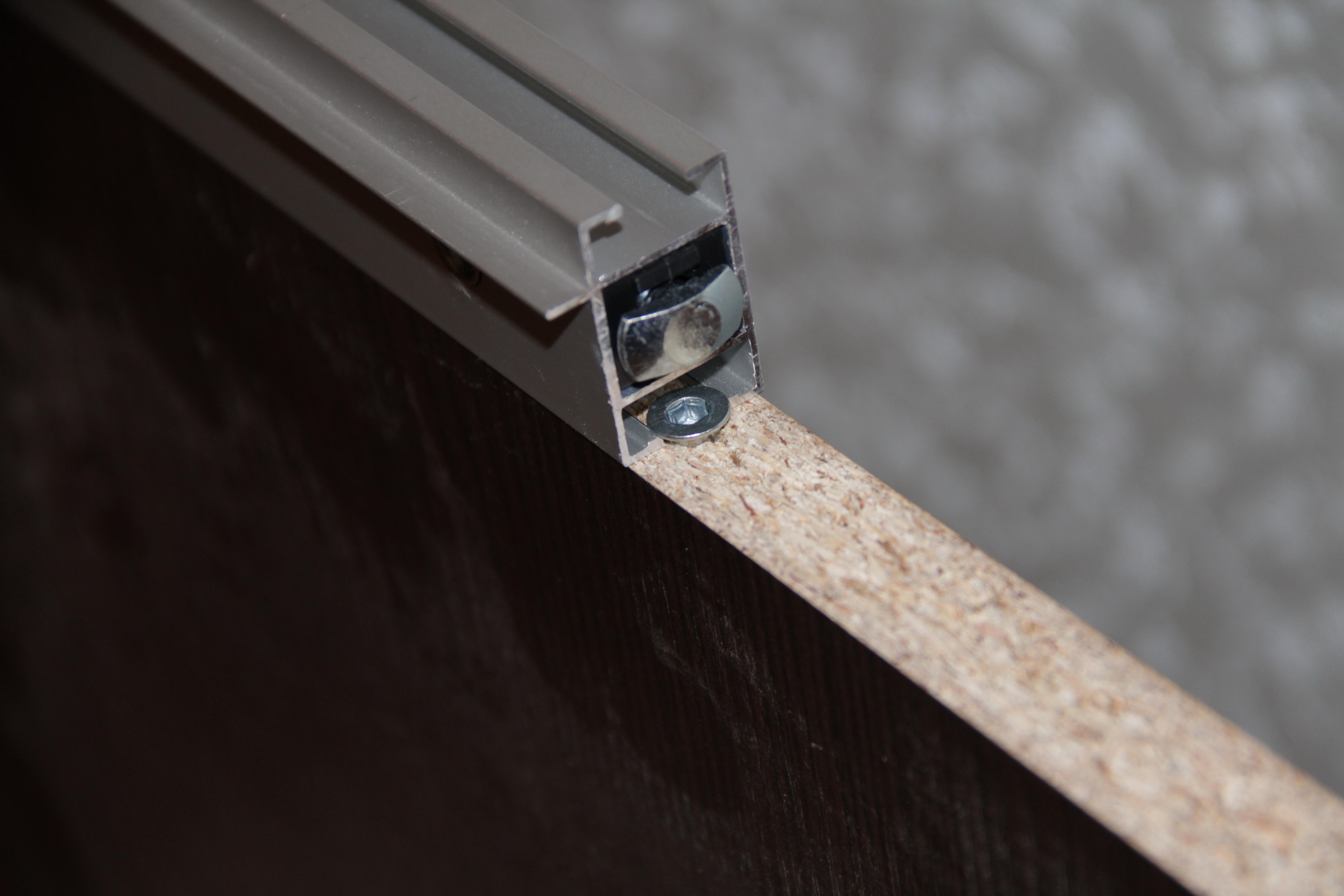 После определения с размерами и заказа профиля начали рисовать карту раскроя листа ЛДСП. Размеры деталей из ЛДСП принимаем равными проему в профиле. А крепление ДСП к профилю в некоторых источниках предлагают на деревянные шканты, но Арсений из Альфорума (Гродно) посоветовал вместо шкантов использовать конфирмат (евровинт). У конфирматов есть большой плюс: шляпка конфирмата немного больше в диаметре, чем зазор в профиле, но и не зажимается в притык тем самым имея возможность подрегулировать расположение листа. Конфирмат поджимается таким образом, чтоб профиль насаживался с легким усилием, тогда не будет люфтов и ДСП будет надежно сидеть в проеме.