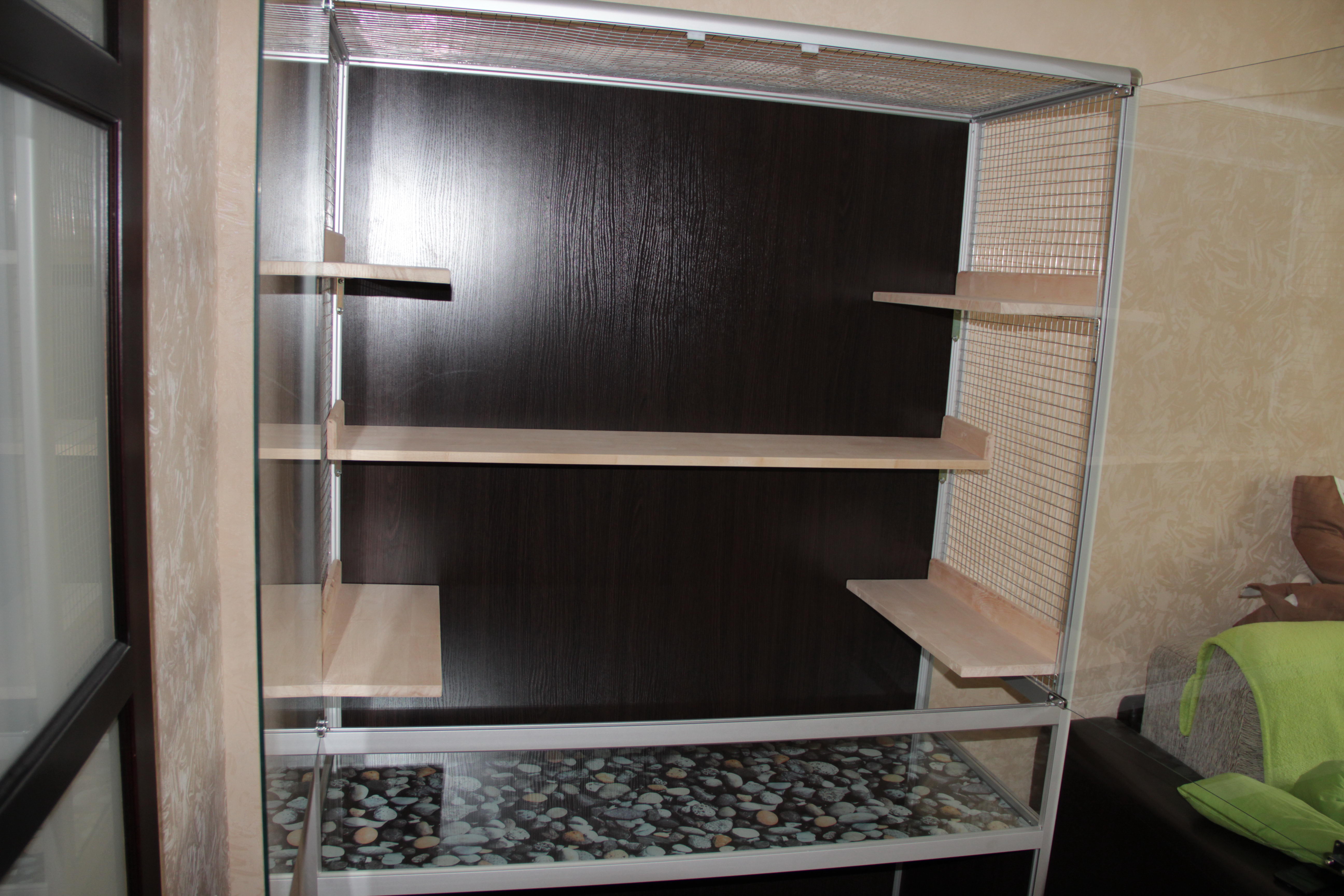 Вот в принципе и все. Витрина собрана и установлена. Элис уже по достоинству оценила новый дом и ждет подругу :) Теперь на прогулки совсем не просится, походу после бурной ночи у нее сил не остается вообще, ну до следующей ночи. Так много всего можно грызть, прыгать, бегать и просто сидеть в своем наблюдательном пункте!